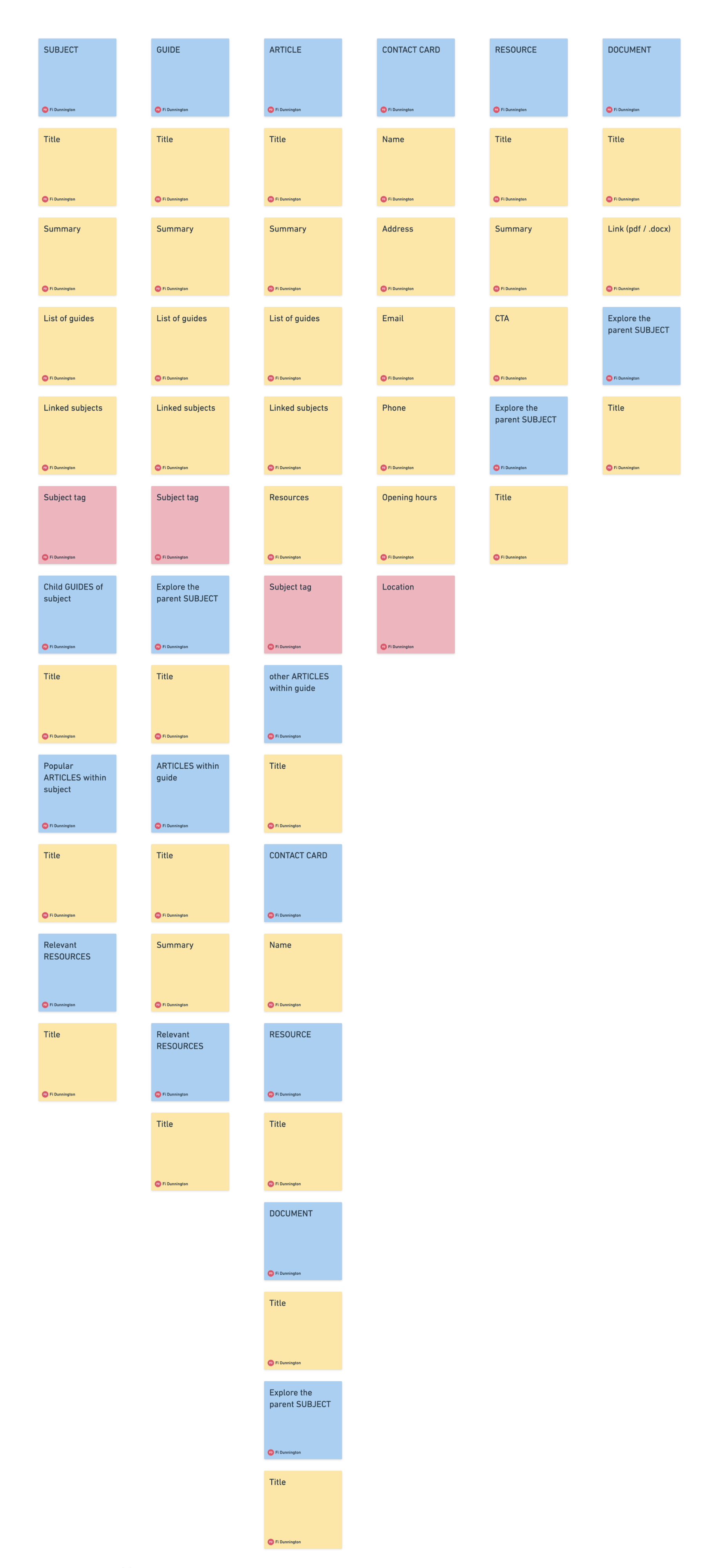 The first step was to define the core objects of the site. Through user research and content analysis, we identified six key objects: subjects, guides, articles, contacts, documents, and resources. Once these were mapped out, the next steps became clear: